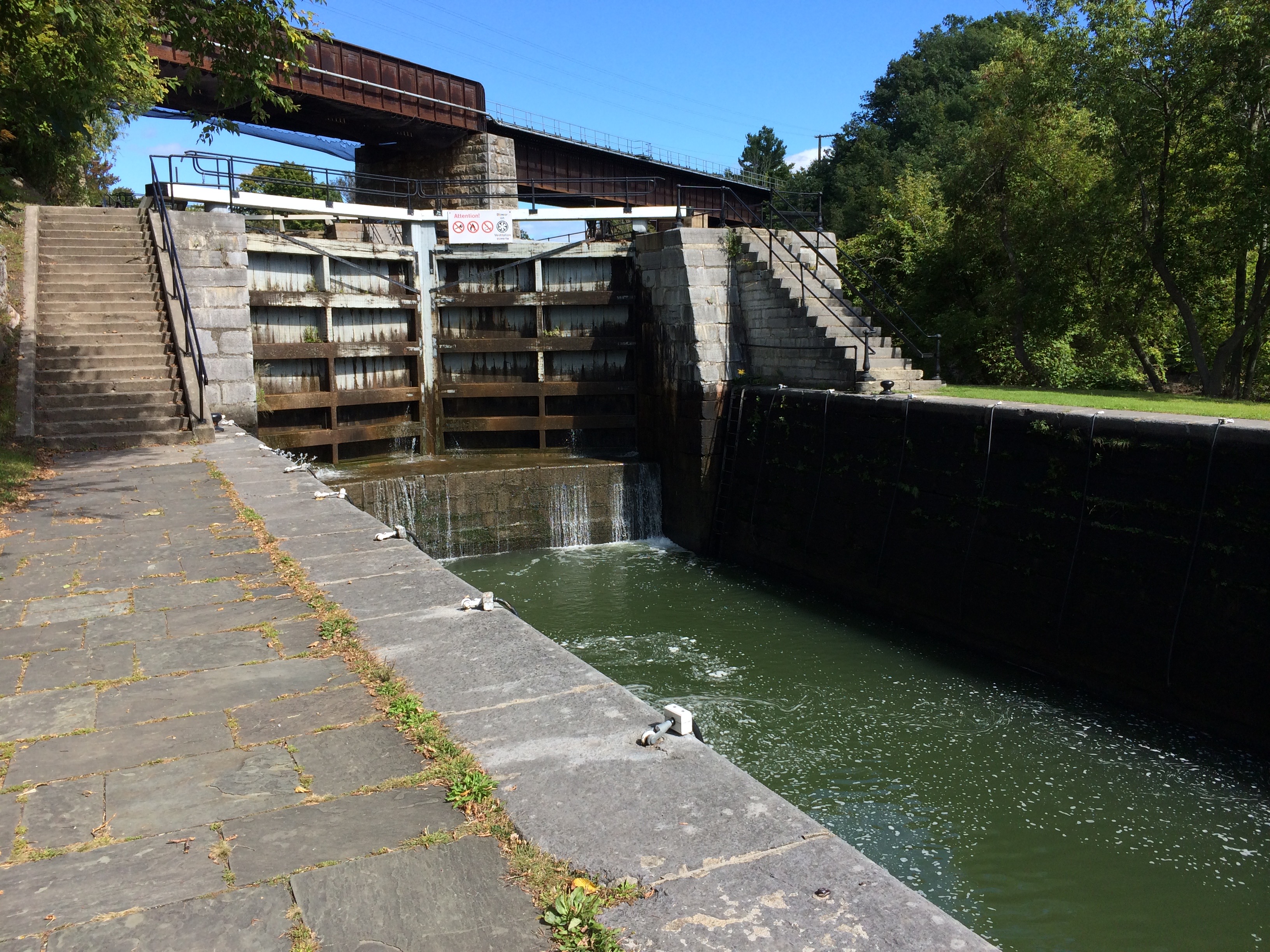 By the time the water reaches a level with the next waterway ahead, I’m looking ten feet down to maintain eye contact. Soon the couple is on their way, headed for Cranberry Lake, while the two men winch the gates closed in the boat’s wake.