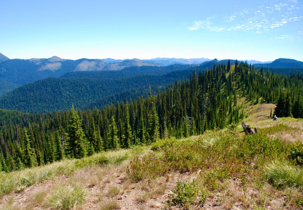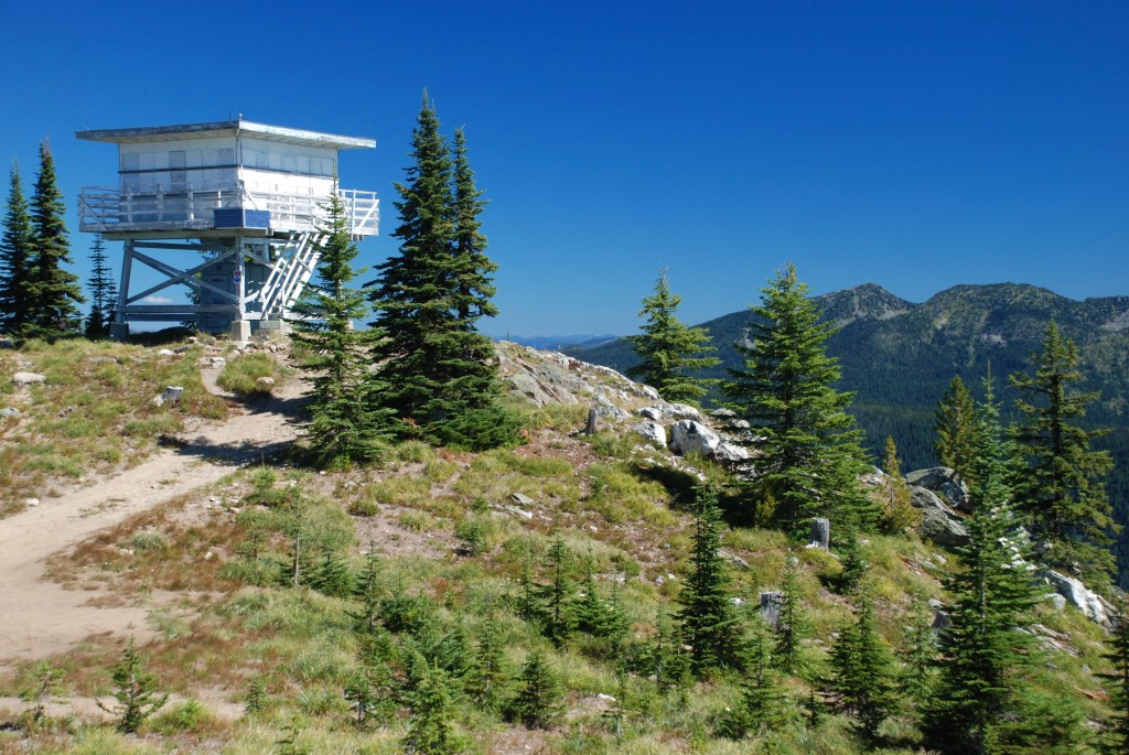 From the mountain summit, I view the surrounding mountain ridges of the wilderness, north toward Canada and southwest to Gypsy Peak, the tallest mountain in eastern Washington. The old lookout stands on the summit, staffed from construction completion in 1964 until 1976 when such fire lookouts were no longer needed. The square, white, flat-roofed structure poses prominently, rising on stilts above nearby trees. Stairs rise from the ground to a promenade encircling the lookout that once offered fire watchers a 360-degree view.