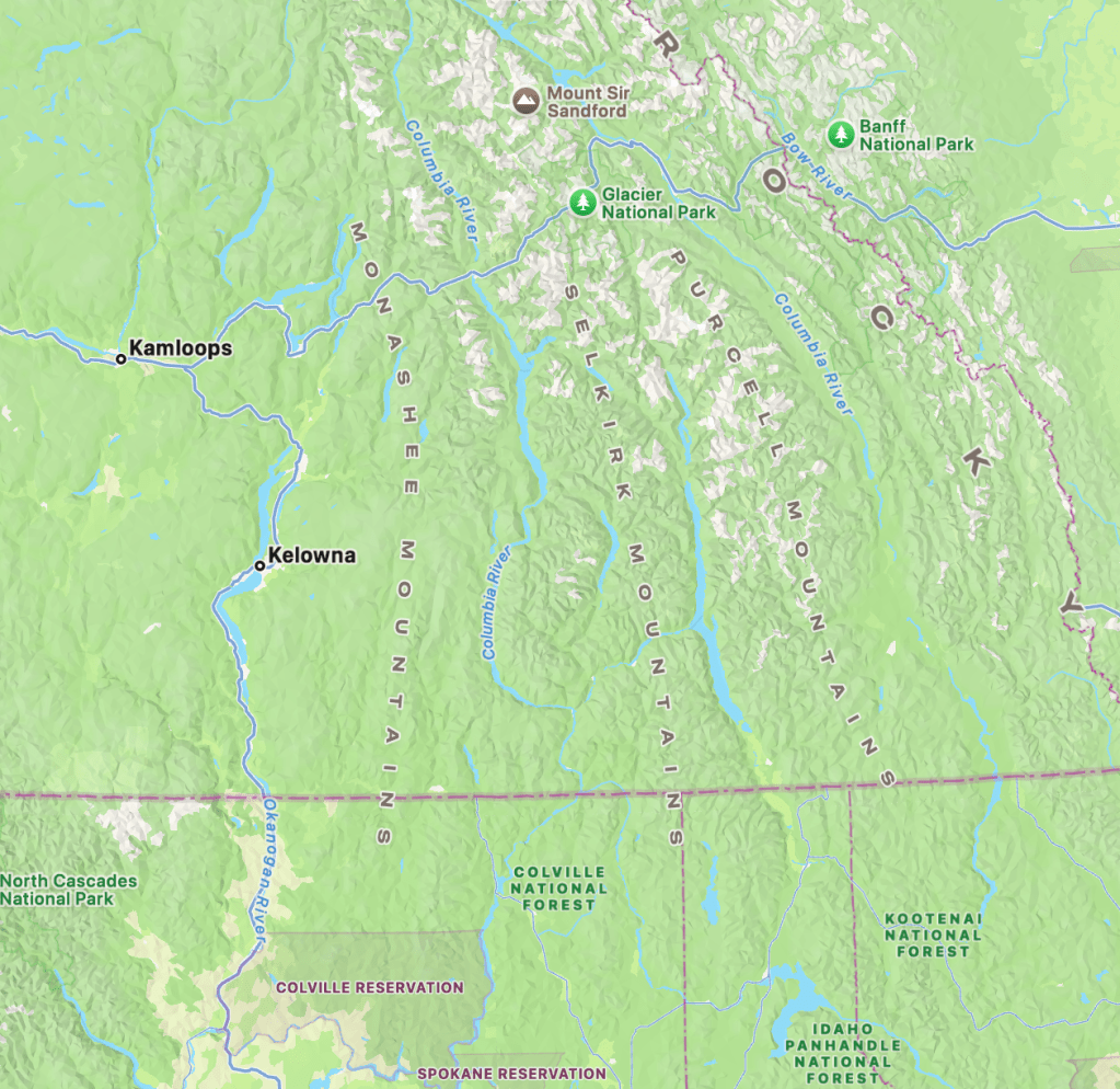 The Columbia Mountains are named for the Columbia River that flows north from Columbia Lake lying in the Rocky Mountain Trench in BC. Passing the northern end of the Purcells, the river later rounds to the west and south to outline the northern end of the Selkirks. The Columbia, having turned south, passes between the Selkirks on the east and the Monashees on the west. These geologically distinct foothills of the Rockies are collectively referred to as the “Columbia Highlands,” taking its name from the river and mountain range.