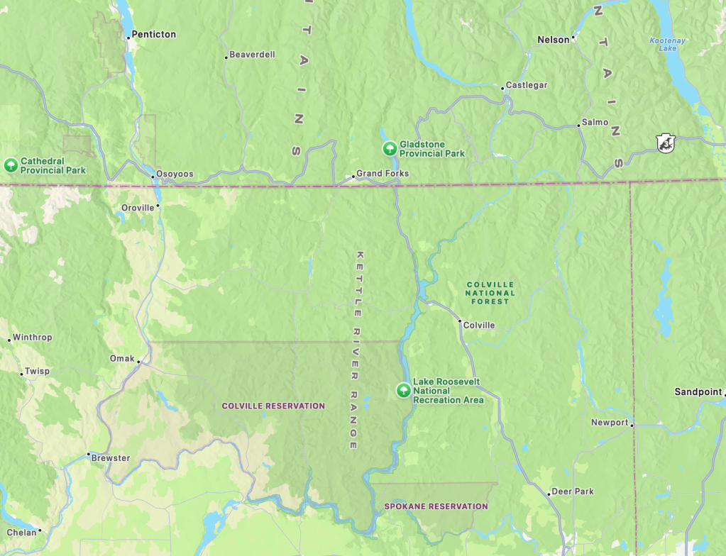 The southernmost subrange of the Monashees, where they enter the U.S. into Washington, is called the “Kettle River Range.” The Kettle River rises in the BC Monashee Mountains and flows south and southeast to dip into Washington then turn northeast back into BC where it makes a hairpin turn to the south, outlining the northern reaches of the Kettle River Range. The river then flows back into Washington where it eventually joins the Columbia River. From the Kettle River at its northern end, this mountain subrange extends south, bordered on the west by the Curlew Valley and the San Poil River and on the east by the Columbia River, ending on the south where the big river turns west.