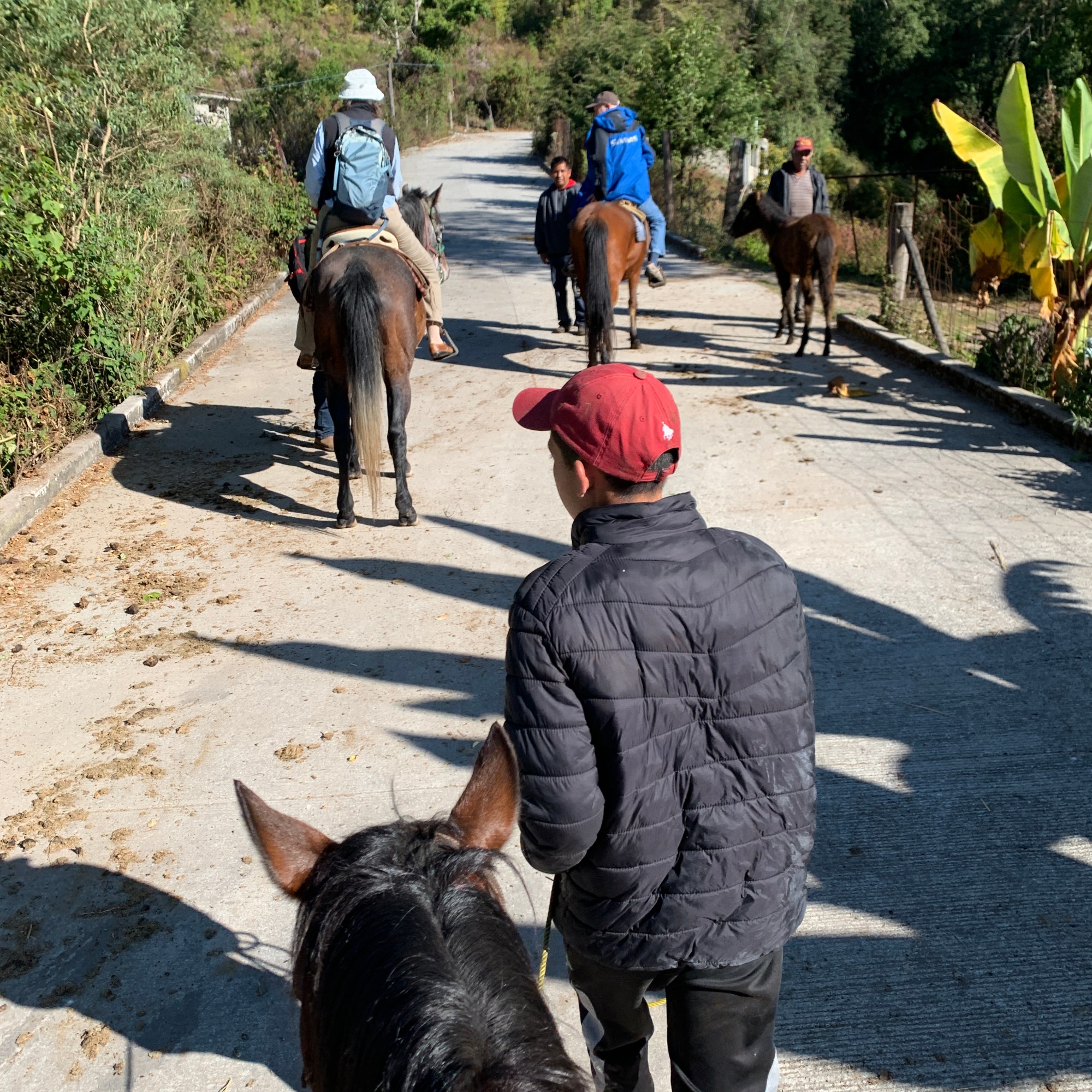 At times the route has become a trench with frequent use, and my horse occasionally falters over a loose rock or exposed tree root. With all the horses similarly lurching up the mountain, they kick up a dust cloud in this dry season. At first Vicente and I are in the lead, so I don’t have much dust to contend with. However, as the foal attempts to keep up with the mare, he’s getting in the way of the other horses and there’s a momentary scuffle with Sondra and others hanging precariously on to their horses. So Vicente holds back my horse with the foal alongside to clear the way for the others. Now that I’m in the rear, I pull my bandana over my nose and mouth to filter at least some of the dust.