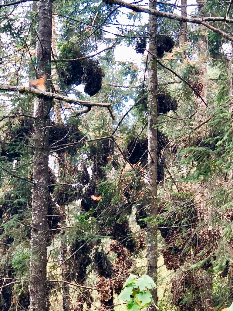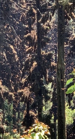 As we arrive, thousands, tens of thousands congregate on the trees’ lower branches on a slope below the top of the mountain. Peering more closely into the depths of the forest, I make out the dark masses of countless butterflies. Resting in those masses, the monarchs’ wings are closed, so the mostly the black and white of the under wings are visible, causing the clusters to look like dead leaves.