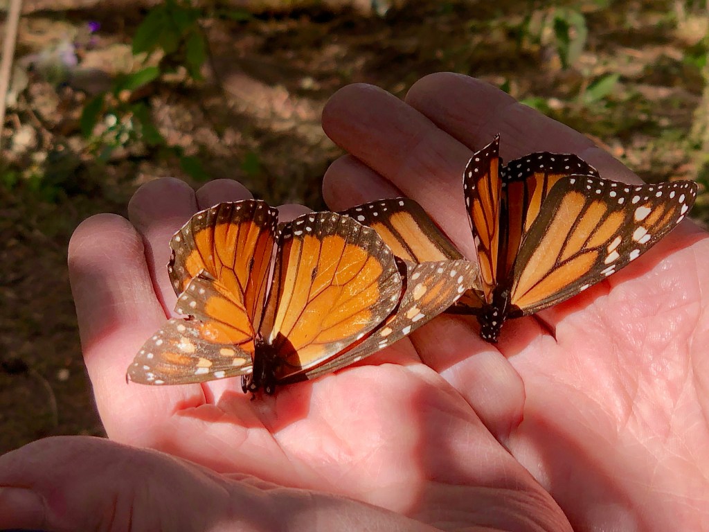 Amy quietly joins us as we notice some dead monarchs on the ground where we sit. “Do you know how to tell male from female?” she asks. Coincidentally, Sondra is holding both a male and a female. “The female has thicker veins that outline the wing’s cells. And the male has two small black dots, one on each hind wing.” These I later learn are vestiges of scent glands that are perhaps no longer needed and are slowly being left behind in the persistent progress of evolution.