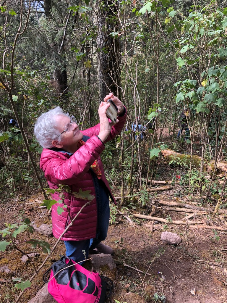 Several of us stop our picture-taking to sit on the ground and simply accept the phenomenon before us. Ana quietly sits behind us. Later she tells me, speaking of being in any of the sanctuaries, “When I’m here, I never want to leave.” Eventually we all must depart, but for these grateful moments we look up to monarchs filling the sky. The butterflies flutter overhead as they have for thousands of years. A constantly changing kaleidoscope of black and orange against blue.