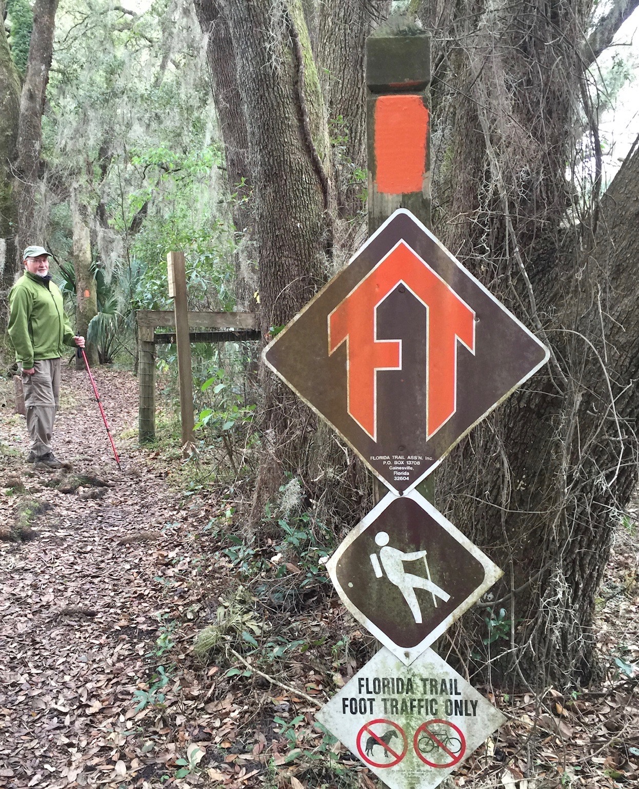 SR 19 then mounts a high bridge over the canal, high enough for the imagined barge traffic that would have used the canal. Then a right on Rodman Dam Road at a sign for the greenway, passing through dense forest on both sides of the road. The Florida Trail has made it’s way north through Ocala National Forest and emerges to cross the road.