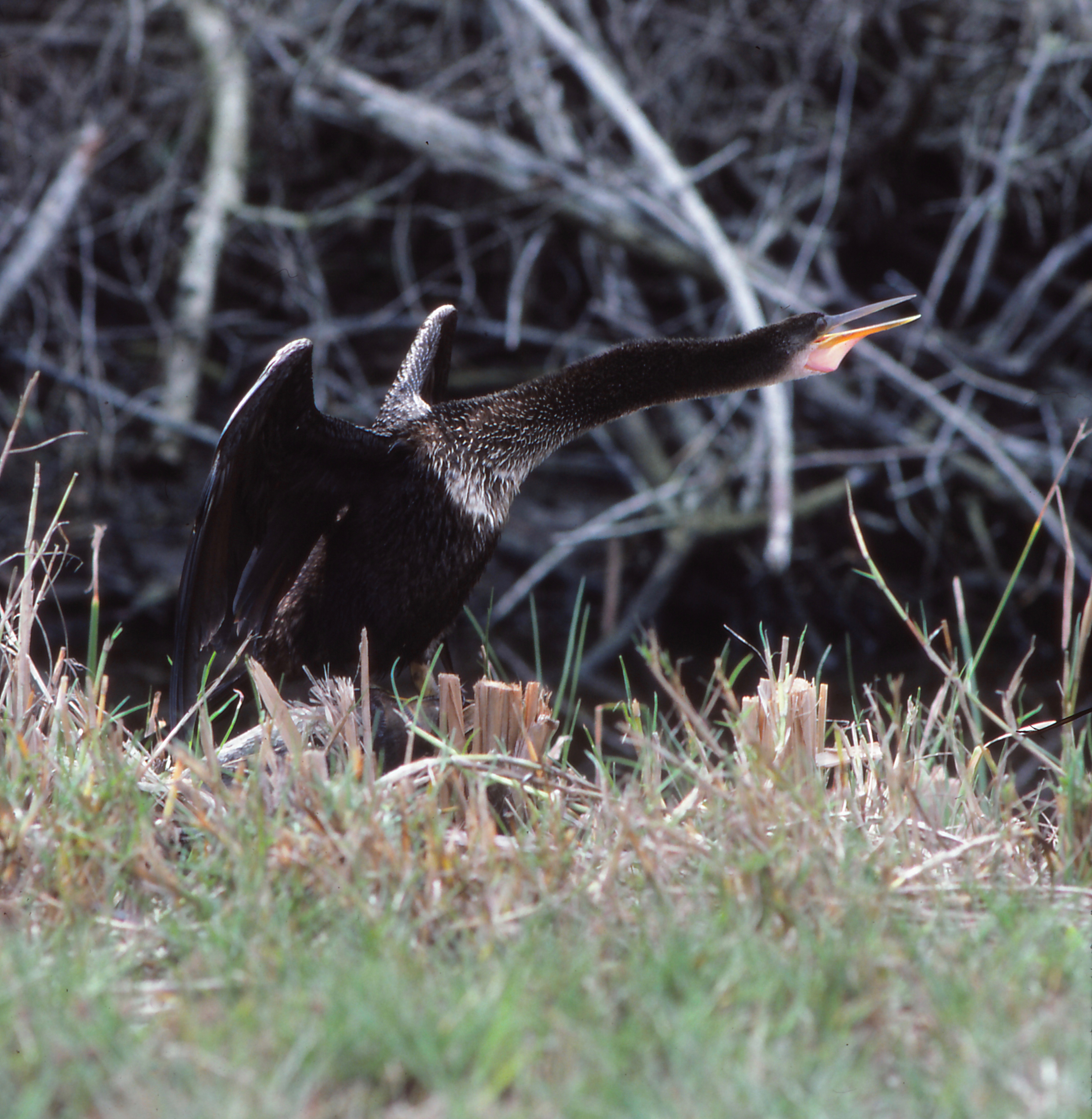 The road crosses the top of the dam, so we drive on across to a side road that turns down toward the bottom of the dam, passing along an old meander of the Ocklawaha that has been cut off by the outflow from the dam. The road ends at the river near the bottom of the dam where the lake water gushes out and flows on down the Ocklawaha to its confluence with the St. Johns. People with fishing poles expectantly wait for bass to come through, as do double-crested cormorants (Phalacrocorax auritus) perched on nearby floats.