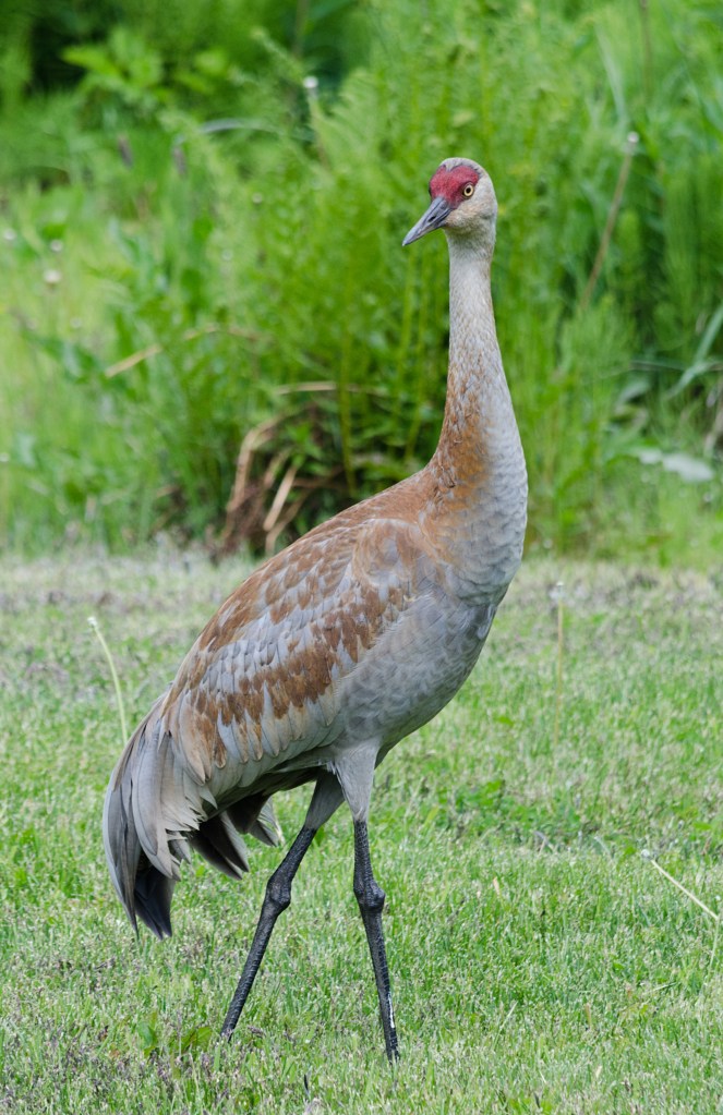 Sandhill cranes are surprisingly heavy bodied to be so tall, over three feet, with greater sandhills topping four feet. Wingspans reach six feet. Gray plumage on the body, usually with a brown wash like a mud stain on the feathers, which it is in fact; the cranes daub themselves with mud and decaying marsh vegetation to provide a bit of camouflage to their already somewhat dun color. With feathered white throat and a red crown patch of caruncular skin, sandhills are easily distinguished from other long-legged, long-necked birds, such as herons and egrets.