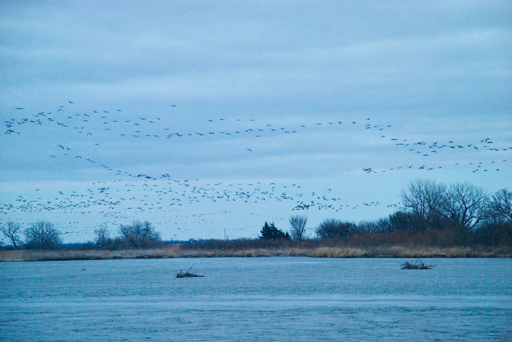 She also mentions that ducks, pelicans, and other waterfowl can be seen in the Rainwater Basin to the south where several hundred wetlands cover tens of thousands of acres. Along with this stretch of the Platte River, the Rainwater Basin is also part of this stopover for migrating birds following the Central Flyway. The numbers are staggering: more than three million snow geese (Anser caerulescens), four million mallards (Anas platyrhynchos), nearly a million each of white-fronted geese (Anser albifrons) and pintails (Anas acuta), and a multitude of other migrating birds. Along with the cranes on the Platte River, the area hosts seven to nine million birds each spring, a concentration of birds occurring perhaps nowhere else in the world.