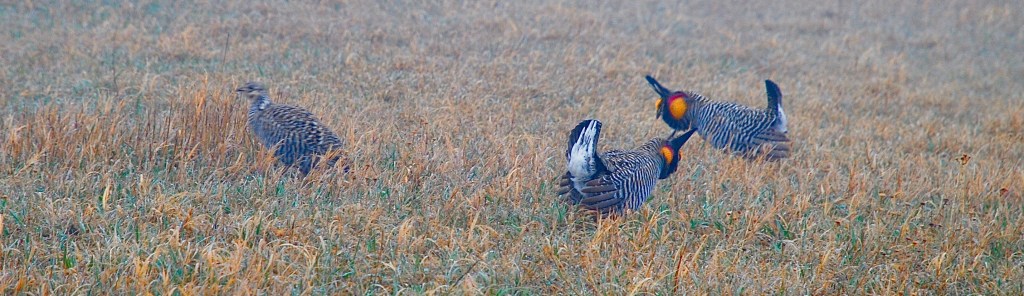 The male prairie chickens come to the lek in the spring to strut their stuff and challenge each other for the center of the display ground, basically showing off for the female and hoping to be chosen to mate.