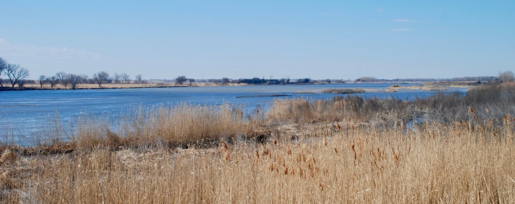 Coming to a junction with Alda/Juniata Road, I turn back north and cross the main channel of the Platte River, passing the Alda Roadside Viewing Site on the left. Here an elevated wooden walkway on the north shore of the river will be good for watching the cranes as they come to the river in the evening. Continuing on, I soon cross a small braid of the Platte and, just beyond, turn into the Crane Trust Nature & Visitor Center on the right.