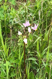 I stop and walk a piece of the paved rail-trail, looking to either side hoping to see shooting star. Each small flower in a cluster points downward with an upward sweep of its petals. I see starry false solomon’s seal, prairie phlox, wild geranium, and various yellow flowers (Coreopsis, Crepis, Taraxacum) but no shooting star, maybe too late in the season. But I later learn the byway and trail are named for two nearby populations of the flower that were discovered in 1980. So the Shooting Star Scenic Byway at present has no shooting star. Still, the natural area harbors populations of tallgrass species, big bluestem and Indian grass, as well as prairie forbs (herbaceous flowering plants), including rough blazing star, prairie phlox, stiff sunflower, gray-headed coneflower, northern plains blazing star, whirled milkweed, rattlesnake master, and white wild indigo, the latter two state-listed species of concern.