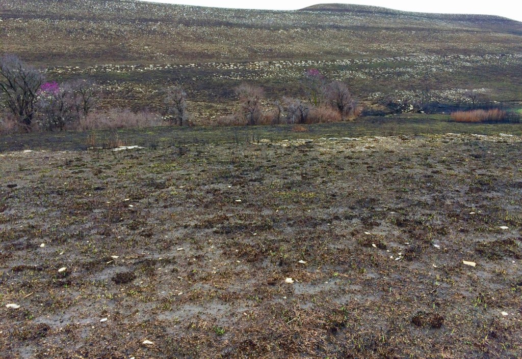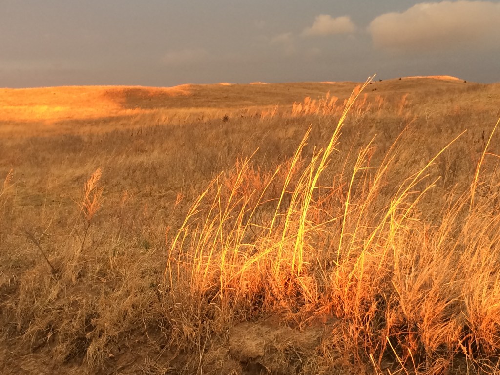 On the seven miles of trail on Konza Prairie, I first pass through woodland along King Creek. Homesteaders farmed these lowlands where water is available and the soil is deeper. Following the trail I ascend the terraced hills of the prairie with dried grass to either side, new grass not yet dominating. The terracing results from differential erosion of the limestone and shale deposited by an ancient inland sea, and also the chert that formed by groundwater depositing silica where it grows into concretions. In some defined plots, prescribed fires set in early spring have burned off last year’s grass and the sprouts of woody shrubs and trees. White limestone stands out against the blackened earth. Most of the tallgrass still lies below the surface, ready to send up this year’s growth—big bluestem, Indian grass, little bluestem, and switchgrass, the bluestems obviously named for the blue-green color of their stems and the base of their leaves during the growing season. I see fresh green grass blades emerging, just a few inches.