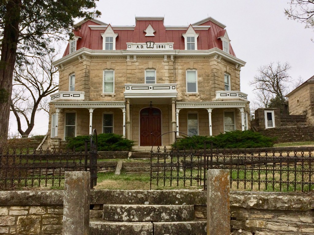 Originally from, of all places, Nashville, Tennessee, Stephen F. Jones met his wife Louisa in Alabama where he had gone to work on a cotton plantation. They migrated to Texas and later Colorado, farming and ranching in each place and becoming rich along the way. In 1876, they reversed their migration and arrived in Chase County, Kansas, where they eventually purchased 7,000 aces along Fox Creek for the ranch, named for the natural springs in the hillside. They employed local craftsmen to construct their grand house, barn, and outbuildings from locally mined limestone. The three-story house with mansard roof commands the property, with the first floor built into the hillside in back and overall possessing eleven rooms and an expansive terraced front garden. Above the second-floor cornice is inscribed “A.D. J 1881.”