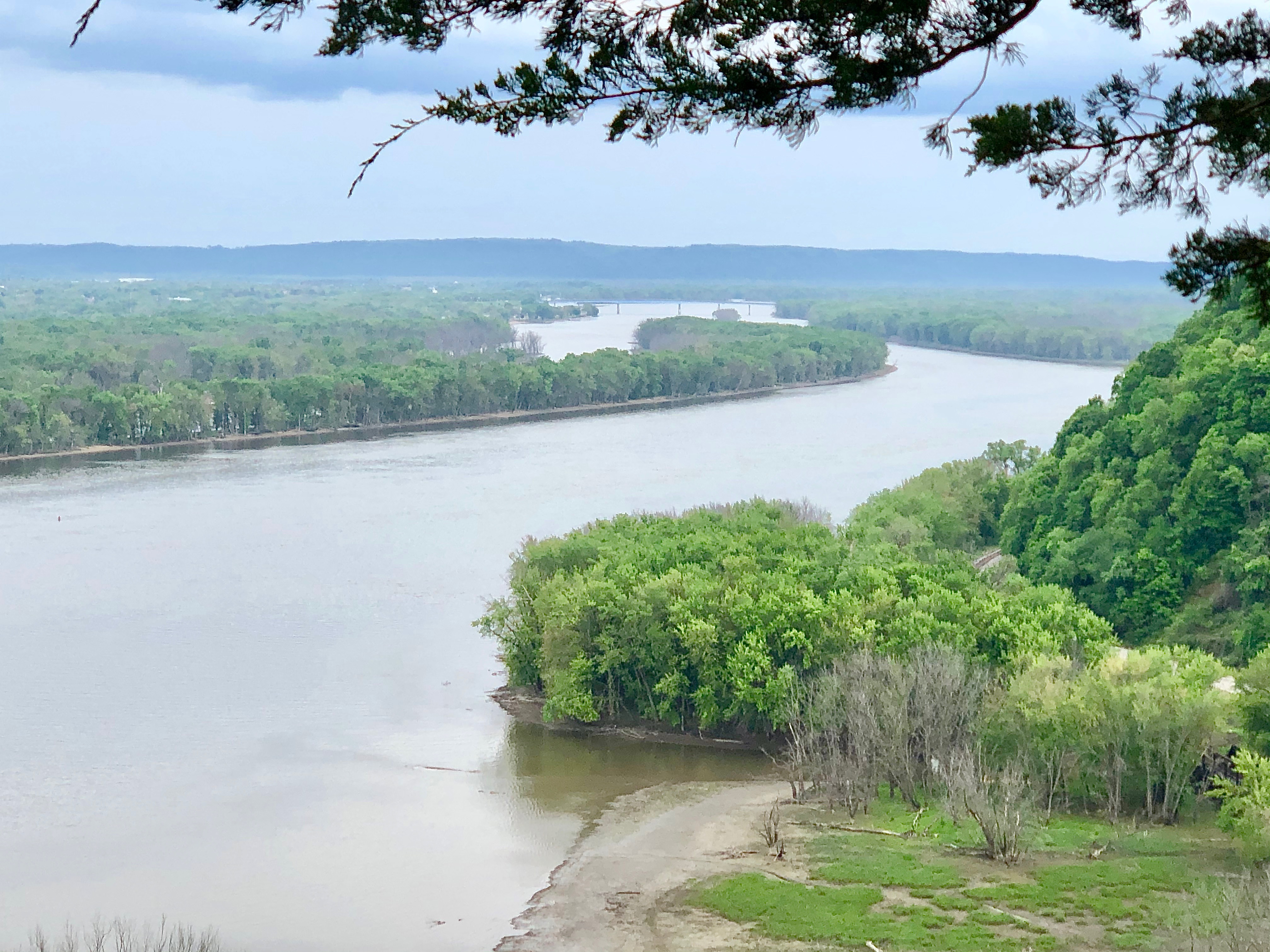 When I arrive in early spring, flights of a hundred or more white pelicans sail gracefully overhead at the “Meeting of the Great Rivers,” where the Missouri from the west and the Illinois River from the northeast converge on the Mississippi just above St. Louis. At rest on the rivers, the white pelicans appear as snow covering the sandbars. Lewis and Clark had a similar experience once they were on the Missouri. “I saw a great number of feathers floating down the river,” Lewis said. “At length we were surprised by the appearance of a flock of Pillican at rest on a large sand bar . . . almost in credible; they appeared to cover several acres of ground.” The Meeting of the Great Rivers National Scenic Byway wanders along the northeastern bank of the Mississippi and then the Illinois for 33 miles from the Missouri-Mississippi confluence north to the Pere Marquette State Park.