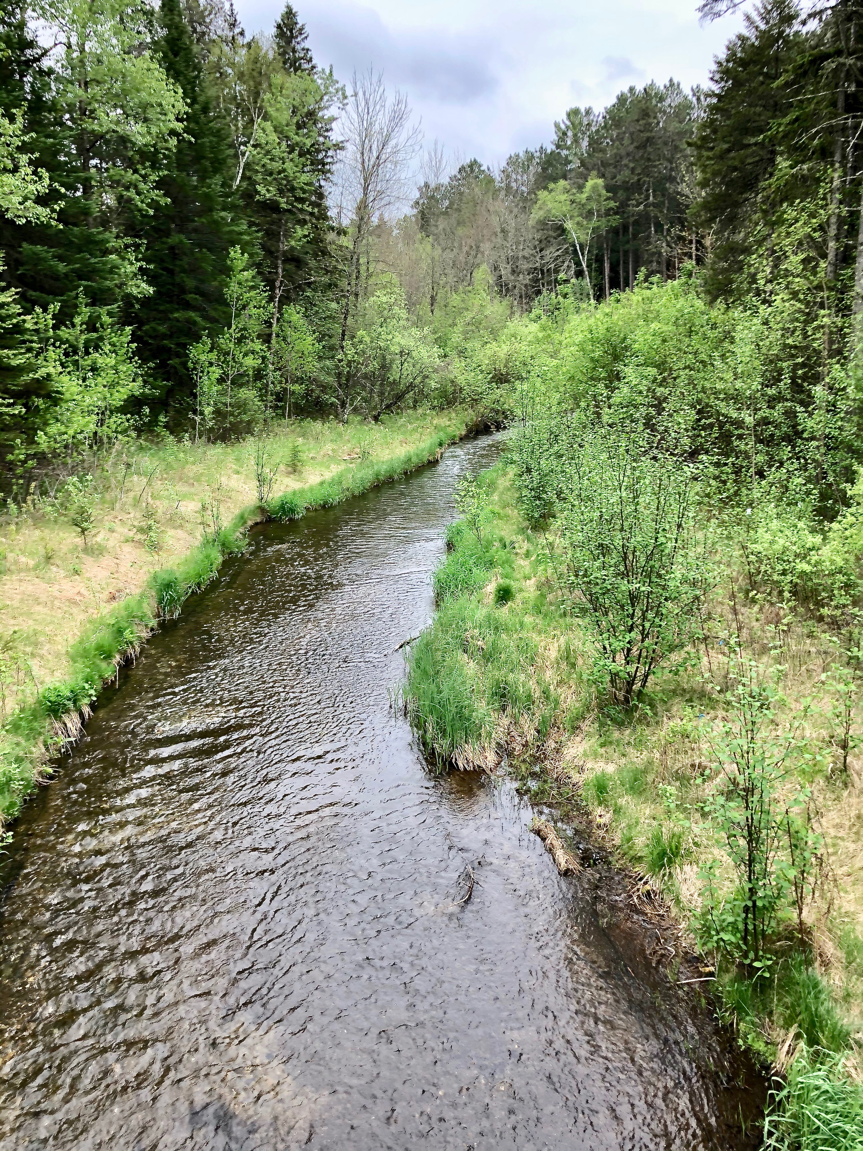 In search of the source of the Great River, I enter 32,000-acre Itasca State Park in northwestern Minnesota that surrounds Lake Itasca. The lake is generally accepted as the source of the Mississippi. Indeed, the outflow from the lake is the first instance in which the name “Mississippi” is used. However, with more than ten thousand lakes in Minnesota, it becomes a bit difficult to clearly separate lakes and streams. For example, Nicolet Creek flows from Nicolet Lake into Lake Itasca. So isn’t the source Nicolet Lake or some other lake or creek that flows eventually into Lake Itasca? Physically, the starting point would be some spring or gathering of rainwater on a slope, whatever’s farthest from Lake Itasca, that flows into a creek that empties into Itasca or some intermediate lake, such as nearby Elk Lake that empties into Lake Itasca by way of the short Chambers Creek. Or up Siegfried Creek that drains from Hall Lake into Elk Lake. Or another lengthy feeder stream that empties into Elk Lake, such as Ga-Gwa-Dosh Creek. Perhaps it helps to distinguish between “headwaters” and “source,” with the entire basin comprising the headwaters and with Itasca Lake indeed the source of the Mississippi.