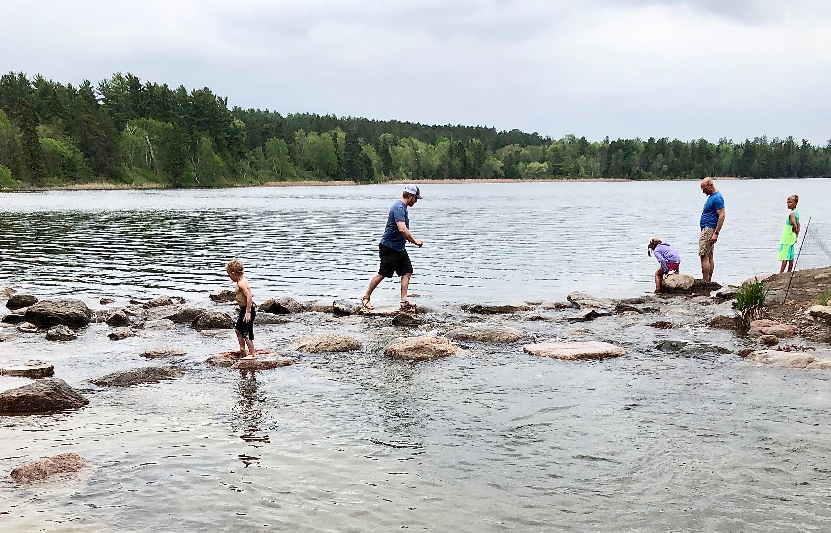 It’s mid-week, so not too crowded. Even so, I join a scattered parade along the broad path to the lake. And there’s the outlet where a line of rocks separates the wide lake from the river. Of course, nearly everyone has to “walk” across the Mississippi River, and so solitude has been sacrificed for having a good time. I’ve seen photos and videos of the outflow from the lake with not a person in sight. The photographer/filmmaker must have asked everyone to stand aside for a moment.