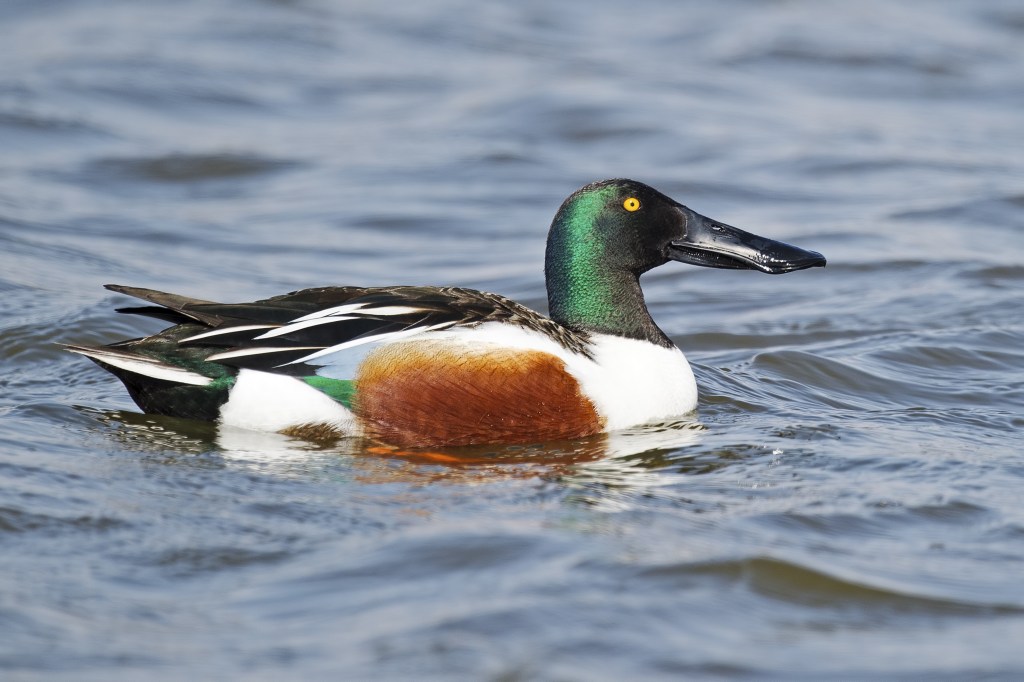 I bend over the right-angle eyepiece to spot the birds paddling along the shore. Since they’re at a distance, I at first have a hard time distinguishing between mallards and shovelers with the males’ similar green heads. But with McGrath’s laminated cheat sheet, I see that while male mallards have a reddish chest, gray body, and yellow bill, the shovelers have a white chest, rust-brown sides, and a black spatula-like bill from which it gets its name. We watch birds for a while: snow goose, hooded merganser, redhead, herring gull, belted kingfisher.