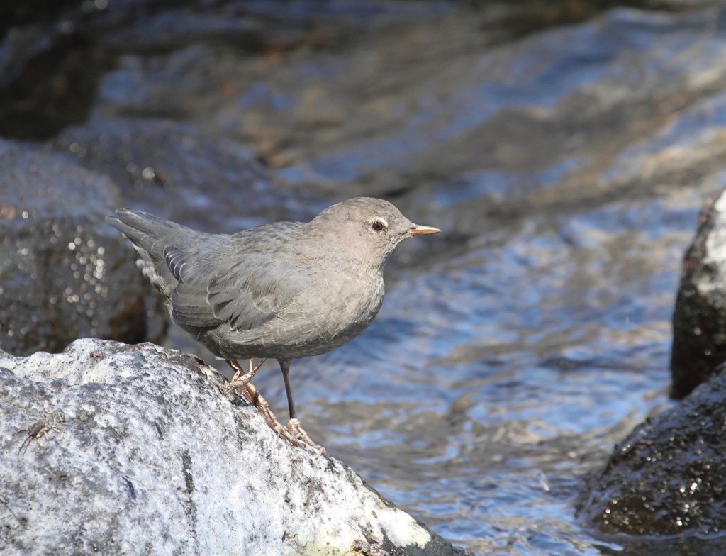 A small gray bird skips from rock to rock, doing knee bends and then bobbing its head into the river, reminiscent of those toy birds a few years back dipping their plastic beaks into water that is soaked up to create a counterweight and causing them to lift their heads long enough for the water to run out before dipping once more. “Some kind of dipper,” I guess, which I later confirm as American dipper. One of the few aquatic birds considered a songbird, Cinclus mexicanus has a twittering, metallic song. In his book, The Mountains of California, John Muir wrote of the water ouzel, another name for the dipper: