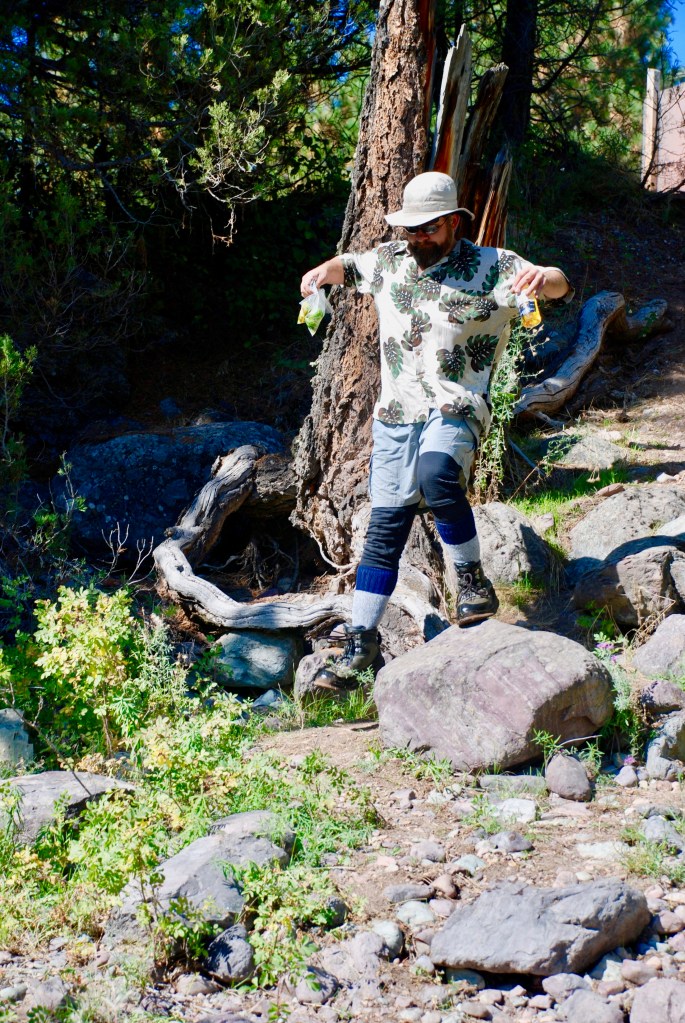 So Jason backs his truck with the trailer carrying the catamaran to the precarious pitch down to the river, where we get it unloaded. Before tipping it over the edge, he gets on the downhill side. “I’ll pretty much do this. You guys just keep it from running over me on the way down.” We grab on the back.